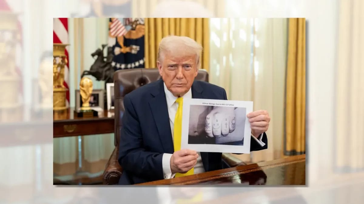 In the photo, Trump can be seen holding a piece of paper featuring a separate picture purportedly showing the tattoos across Abrego Garcia's hand. While publicly available evidence confirmed the image shared by Trump was authentic in origin, it also confirmed that the image had been altered to insert the text "MS-13" above the actual tattoos — in effect annotating them. There was no clear evidence the symbols on Abrego Garcia's fingers proved an affiliation with MS-13. Reporter Jack Izzo has the details.