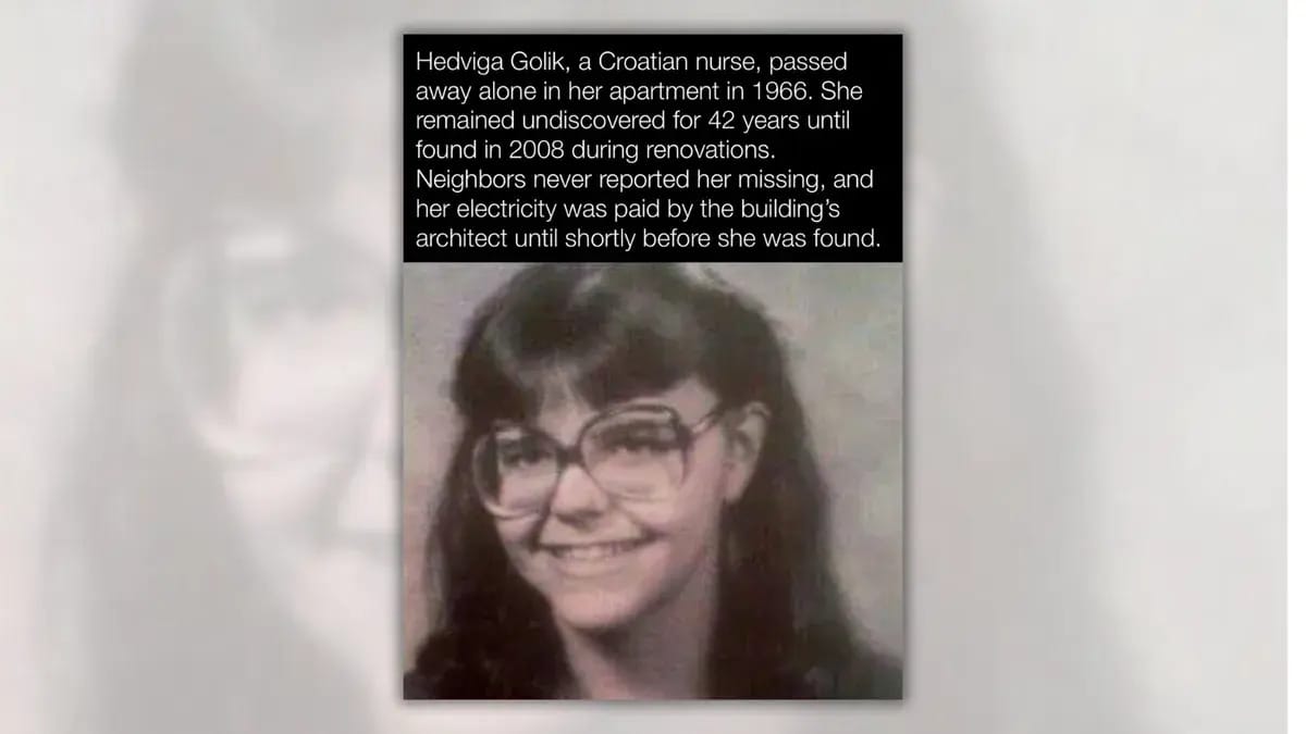 This month, several social media pages circulated a story about a Croatian woman whose death went unnoticed for decades. According to the reports, Hedviga Golik died alone in her apartment in Zagreb — then part of Yugoslavia, but now the capital of Croatia — in 1966. Her body reportedly went undiscovered for 42 years, only coming to light during renovations in 2008.
